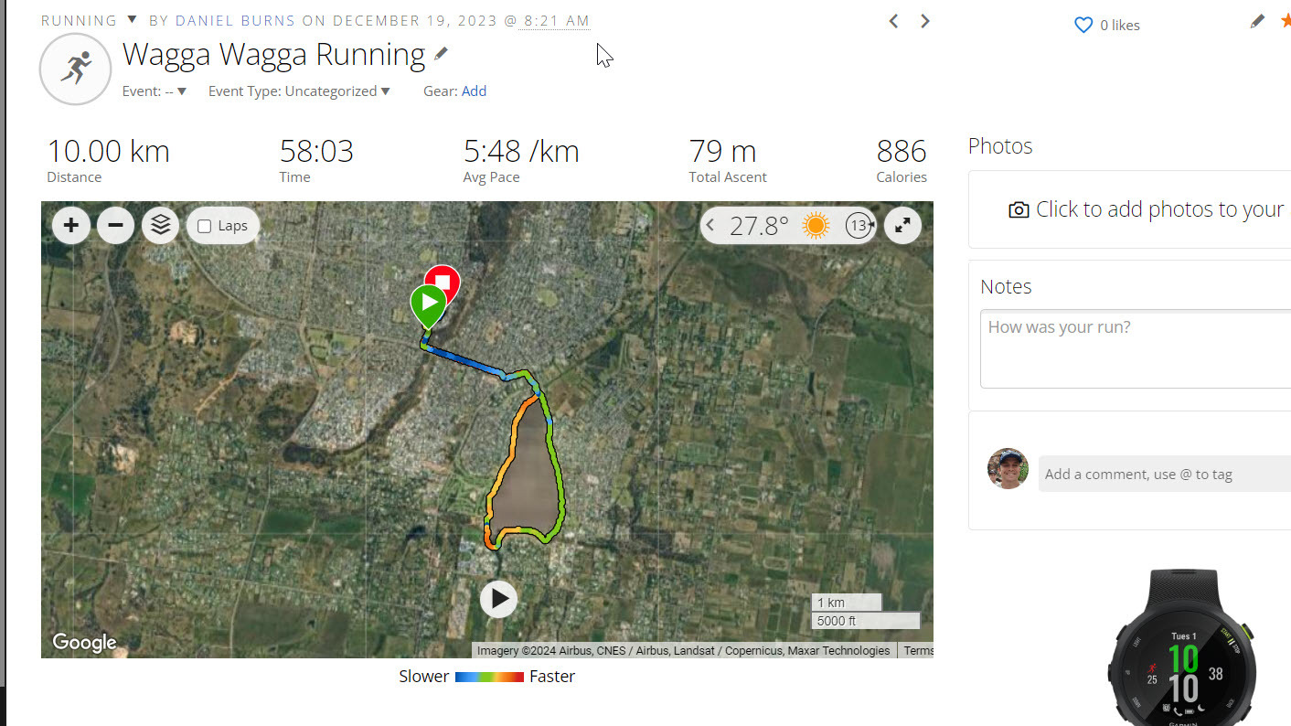 Went out faster as experiment, coped with pace with cardio at start but then slowed a lot in back half and a couple of walks up Red Hill. Weariness in legs after running 2 days ago.